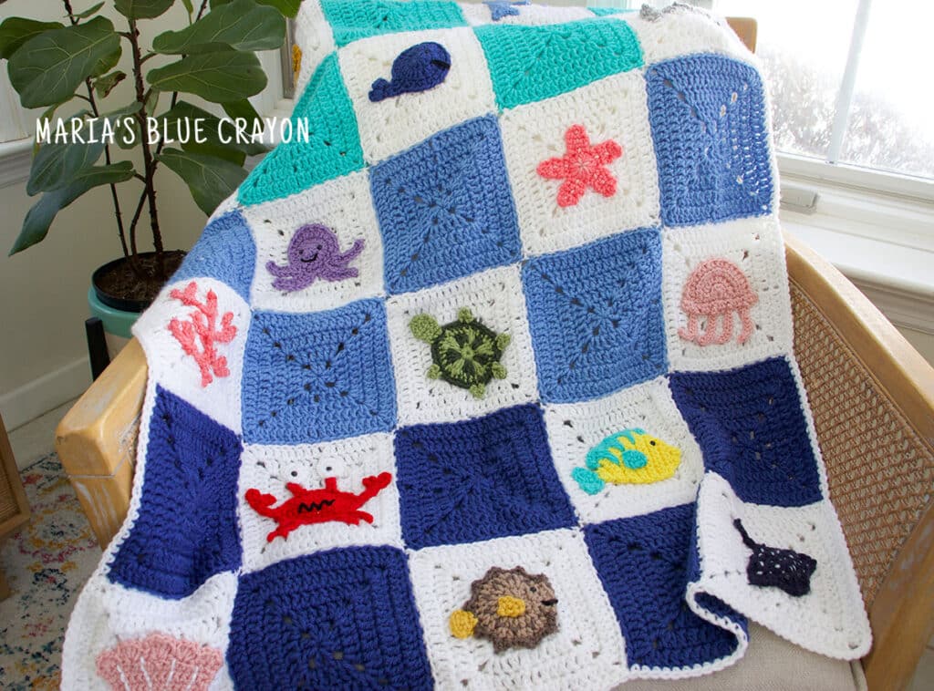 This Ocean Afghan is comprised of granny squares and ocean themed appliques. The granny squares are made separately from the sea creatures. The appliques are sewn directly onto the square in which I have a video tutorial showing how to do so while leaving the back clean.